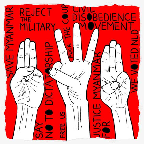 A ubiquitous symbol of resistance among protestors is the three-finger salute, borrowed from like-minded activists in Thailand who in turn adopted the gesture from The Hunger Games. The salute features prominently in the protest art of online collectives such as Art for Freedom, whose mission is to "share art for common use" which promotes the "will of the Myanmar people against the military coup in Myanmar."