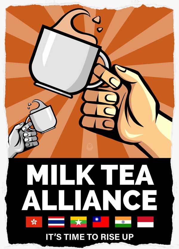 References to the "Milk Tea Alliance" also feature in countless protest images and social-media posts. The name points to milky drinks popular in Thailand, Hong Kong, and Taiwan, where like-minded activists have launched demonstrations in solidarity with those in Myanmar. (India and Indonesia, too, are sometimes included among the Alliance.)