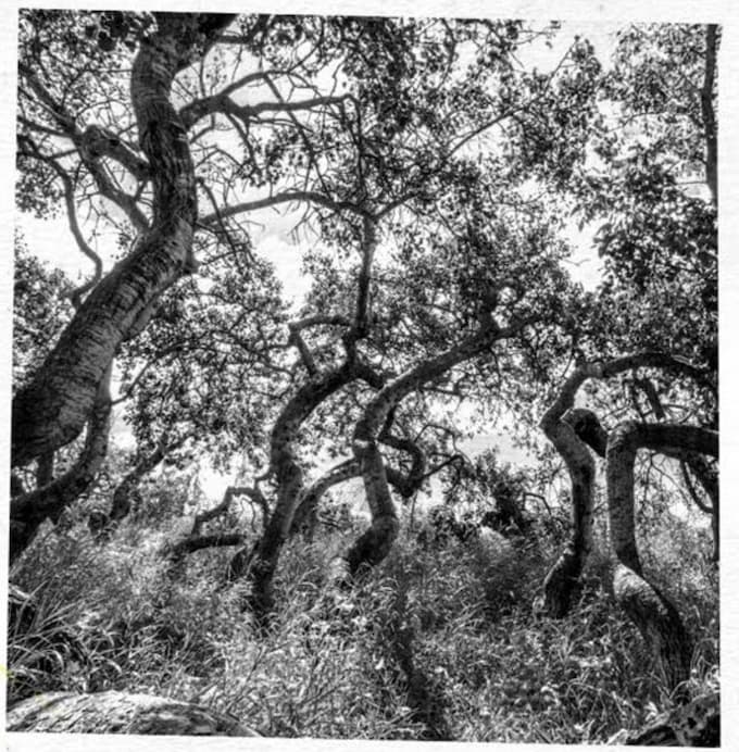 The trees start out straight but then bend, eventually curling so far out of the sunlight that they begin to die. At which point new shoots spring out from the trunk and start growing in a different direction.