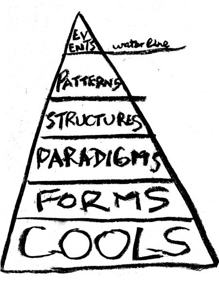 Dana Meadows, la scientifique environnementale qui a coécrit Les Limites à la croissance, nous encourage à penser sous la surface. Dans son modèle de l'iceberg de la pensée systémique, les événements que nous voyons se dérouler, ceux qui font l'actualité, ne sont qu'une infime partie de la vie.